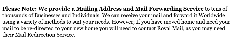 We also offer a wide range of Business Services, such as a Registered Office; a Directors Service Address and a Business Mail Address with Mail Scan & Email and Mail or Small Parcel forwarding world-wide. Our prices for an address in London (E1) start at just £22 per year; Which works out at Less than 43p Per Week!